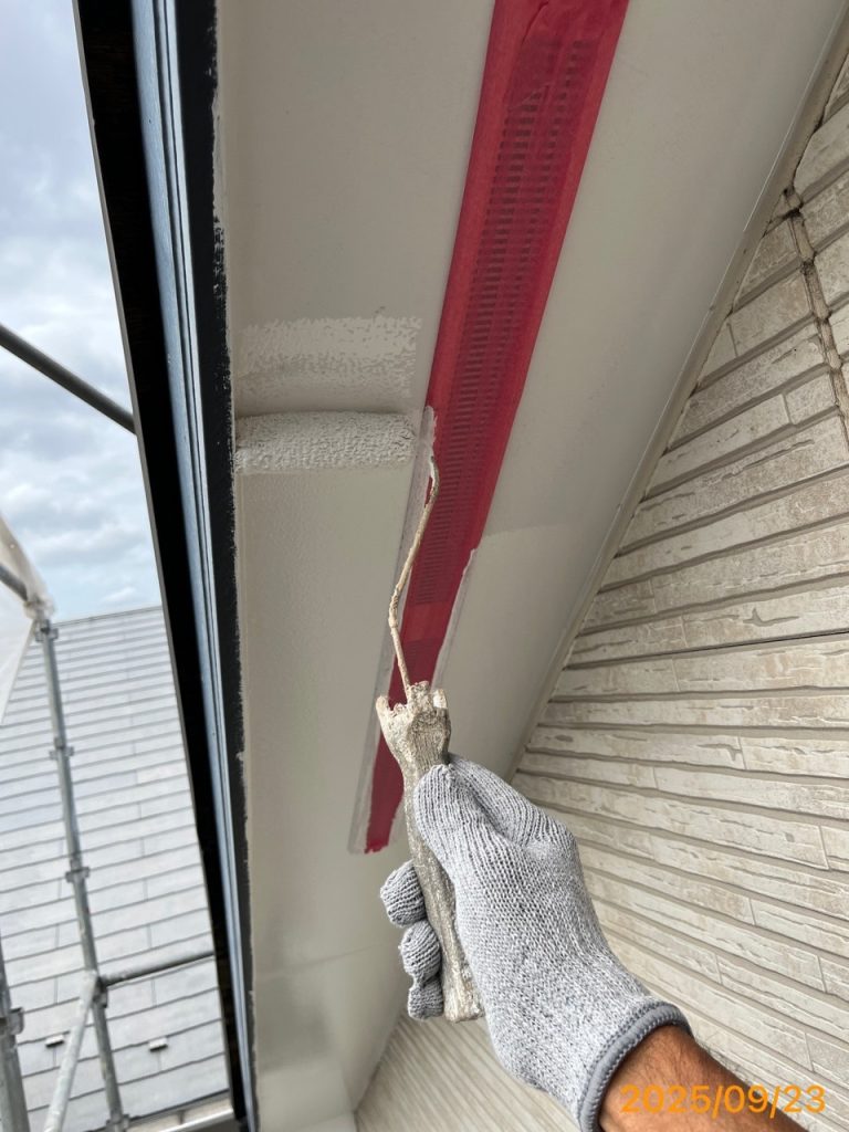 施工中、あきる野市、2件現場、軒天、防カビビールデック、下塗り[あきる野市、足場、外壁塗装、屋根塗装]