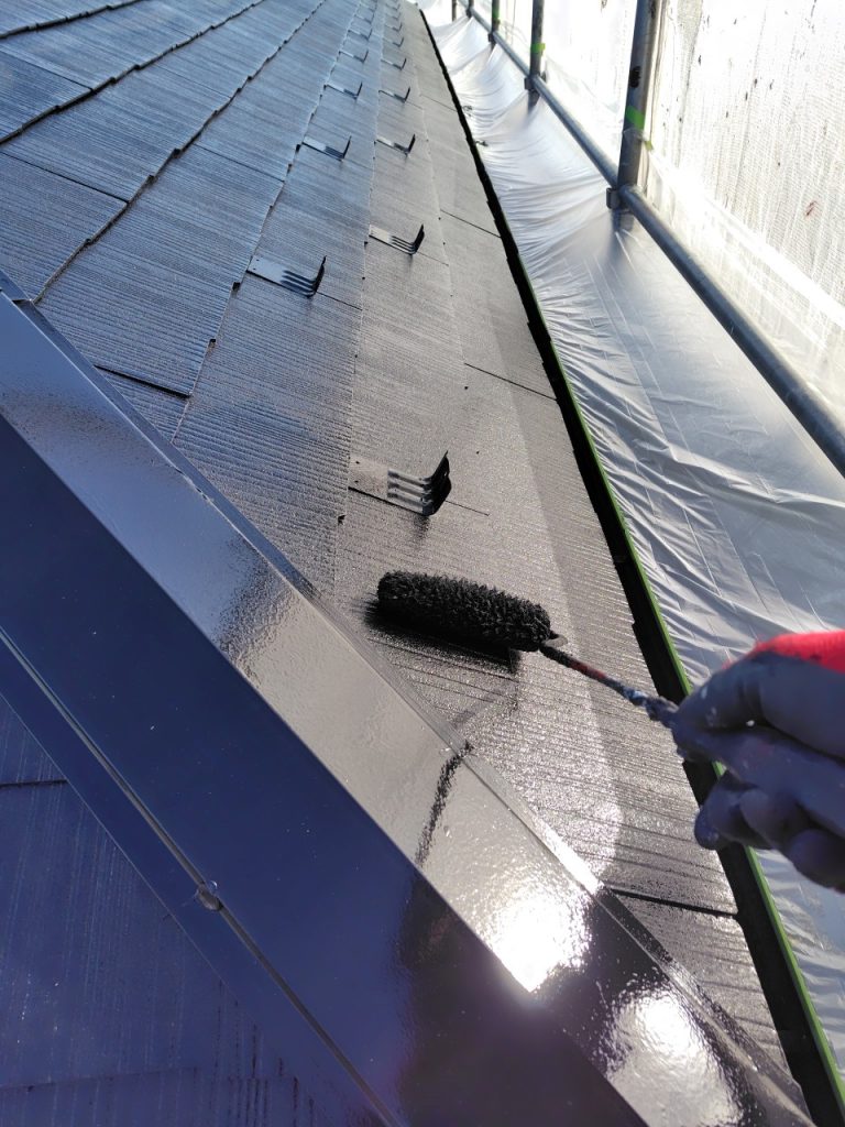 施工中、八王子市、屋根、中塗り、プレミアルーフSI黒